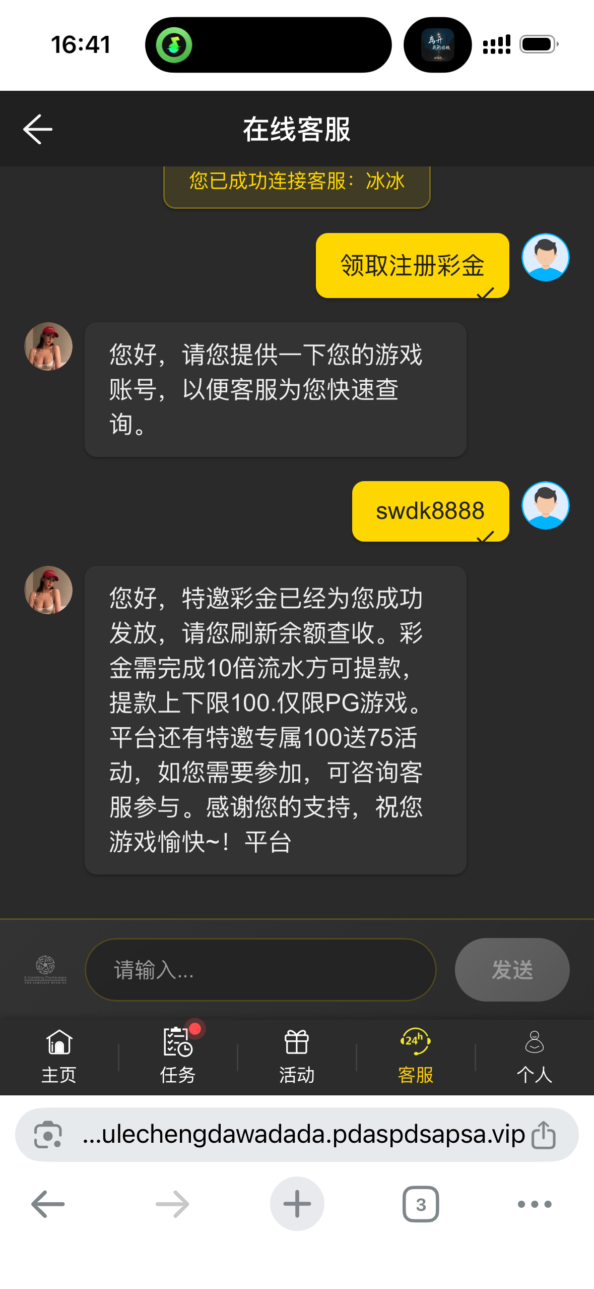 注意事项:注册完善账户信息,联系在线客服申请注册彩金。不建议充值 黑款自行承担