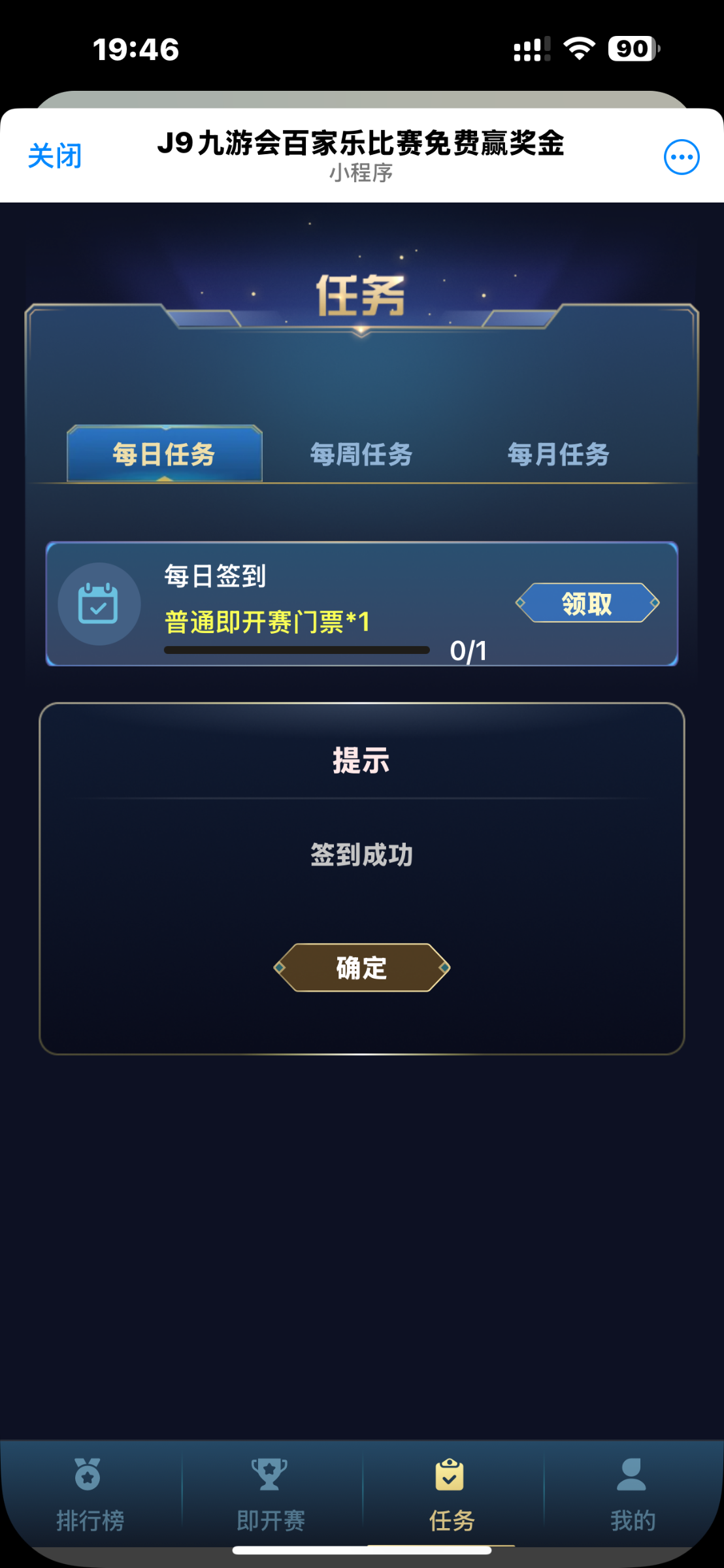 J9九游会百家乐参赛流程:点击机器人发起聊天<立即参赛>进入应用后点击<任务><签到领取门票>获得门票后即可参赛,每人100万筹码,10局比赛赢得5局且赢得5万筹码即可获得奖金5U 【每日签到皆可获得门票】